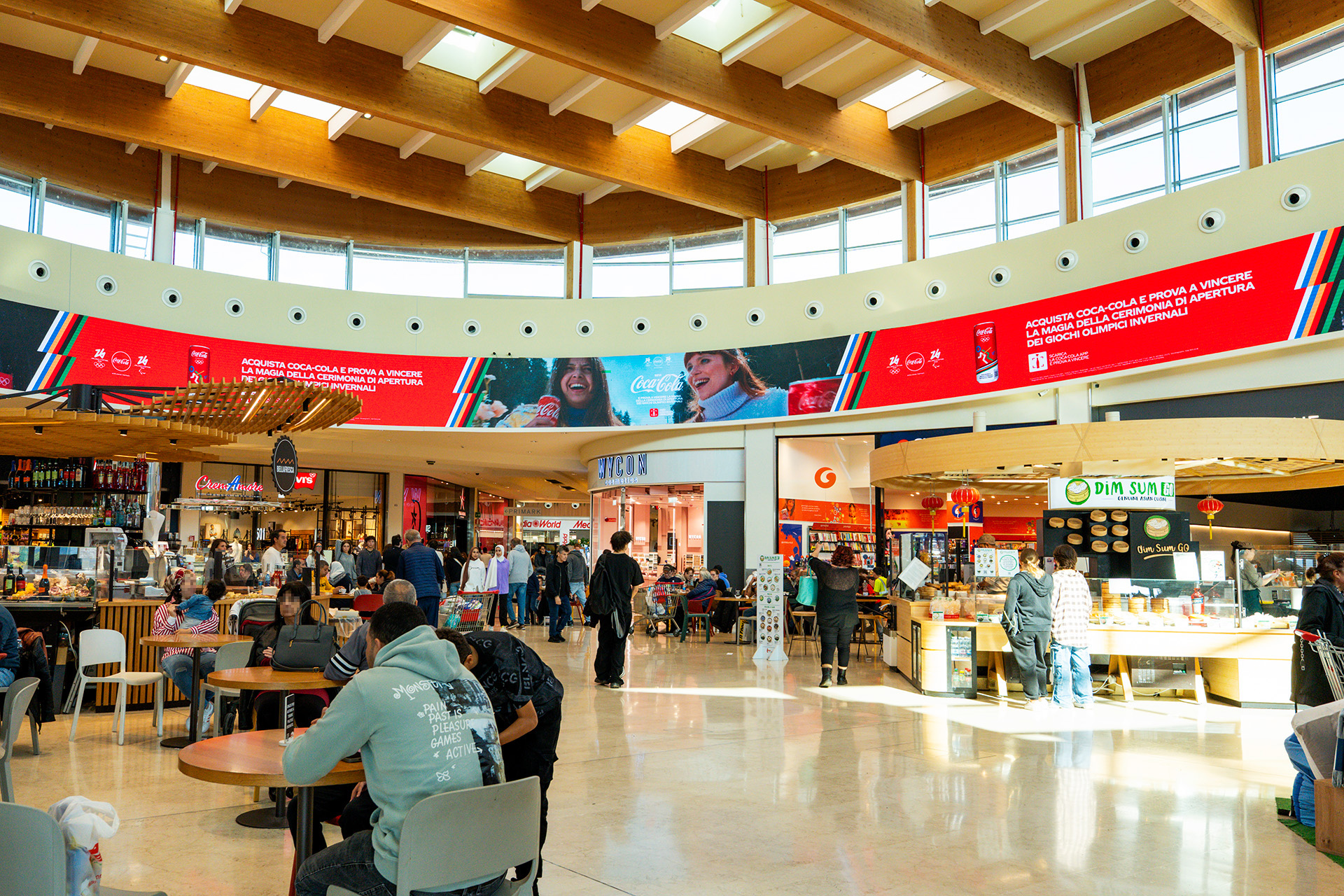 Totem digitali verticali sino a 75’’, posizionati nelle aree di maggior passaggio (ingressi e uscite, gallerie, scale mobili), Raggiungono, con frequenza ravvicinata, tutti i visitatori del centro.